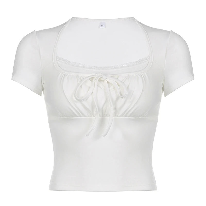 Casual White Knitted Lac Patched Female T-shirts Y2K Korean Style Slim Tie Up Shirring Summer Top Tee Folds Outfits