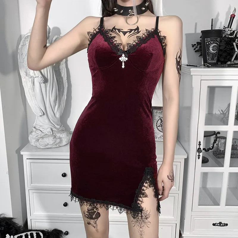Dark Cross Black Mini Dress Vintage Sexy Spaghetti Strap High Waist Slit Dresses Goth Party Club Women Dress
