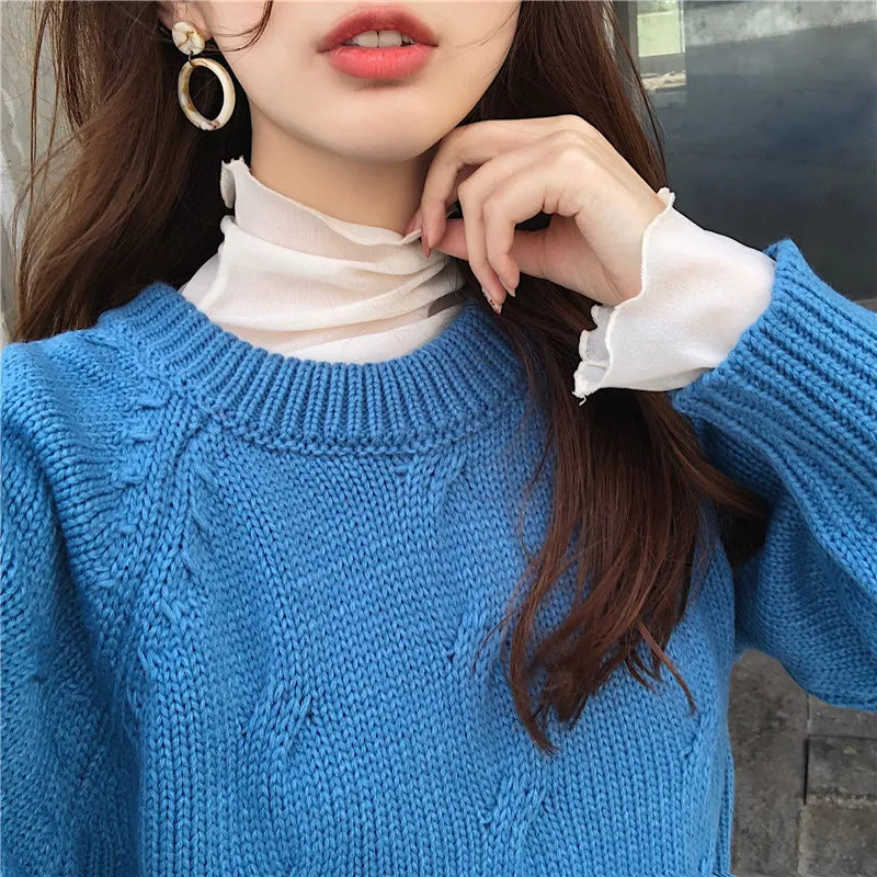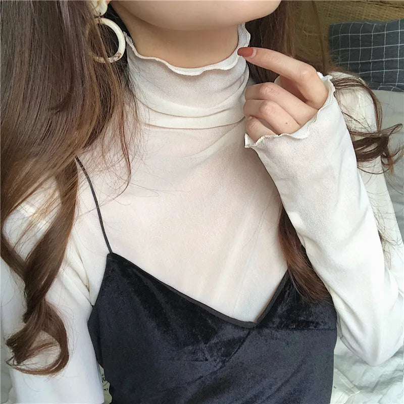 Fashion Mesh Solid Basic T Shirt Long Sleeve High Collar See-through T-shirt Thin Slim Street Casual Tee Shirts