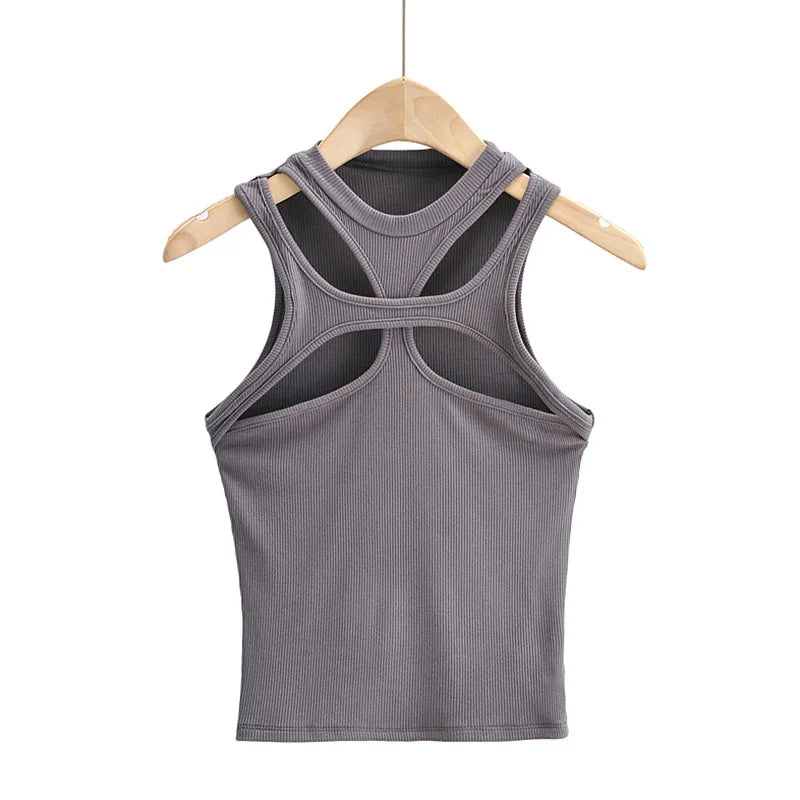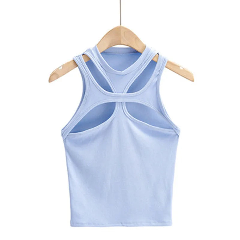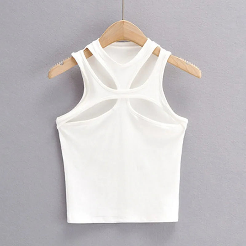 Girls New Asymmetrical Hollow Solid Color Knitted Round Neck Short-sleeved Summer Sexy Vest on The Chest