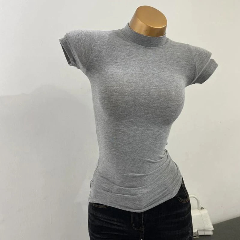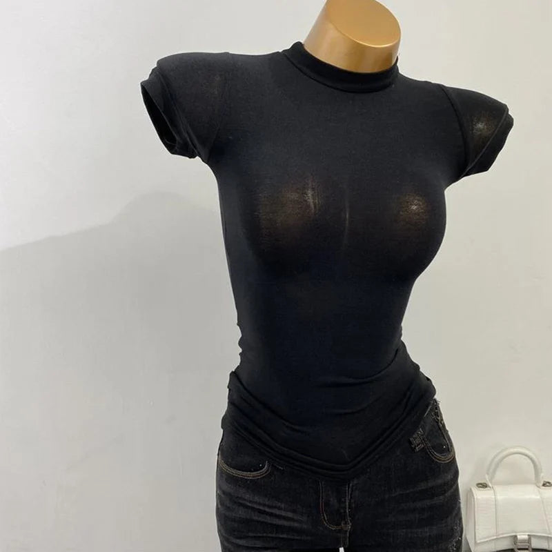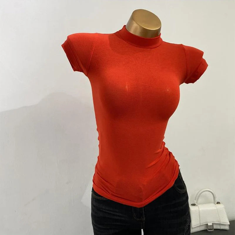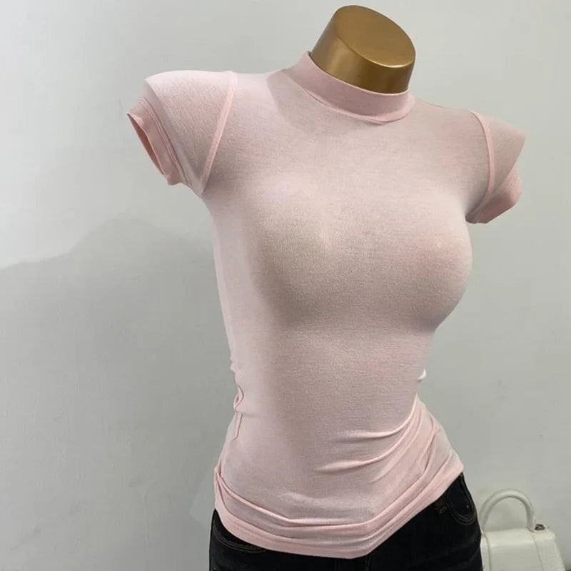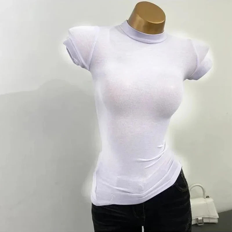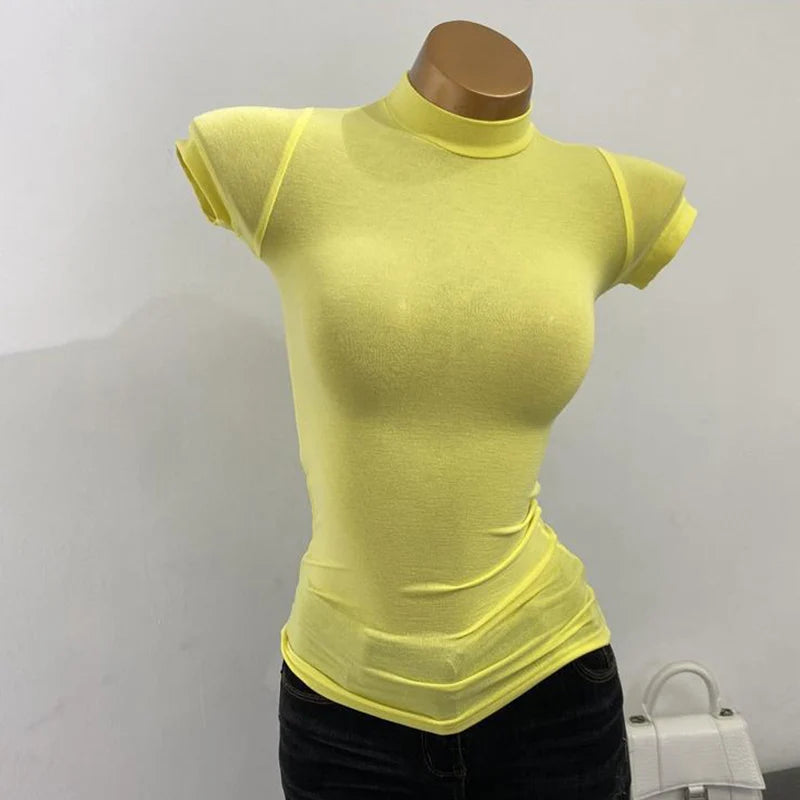Half-high Collar T-shirt korean Transparent Short-sleeved Slim-fit Elastic Solid Inner Bottoming Shirt Sexy Big Chest T-shirt