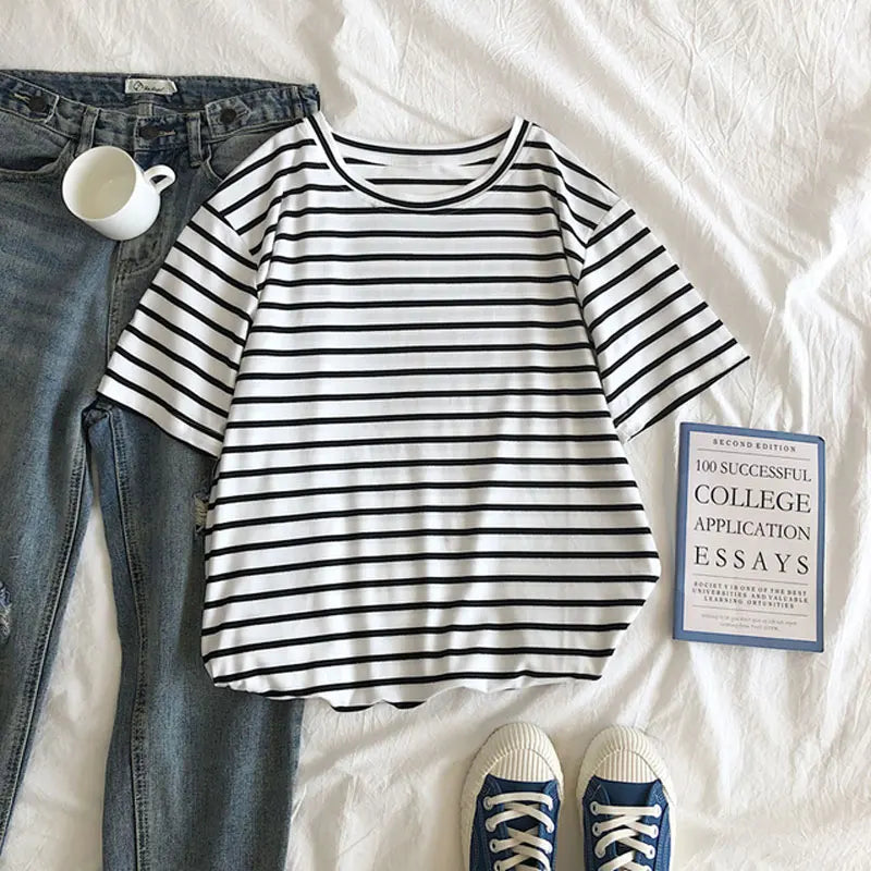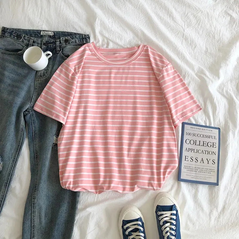 Harajuku Short Sleeve Korean O-Neck Casual Fashion Shirt Camiseta Feminina Tops T Shirt Women Solid Color Striped Punk T-shirt