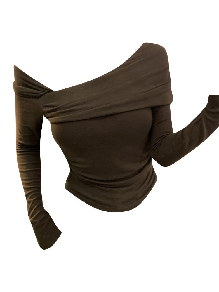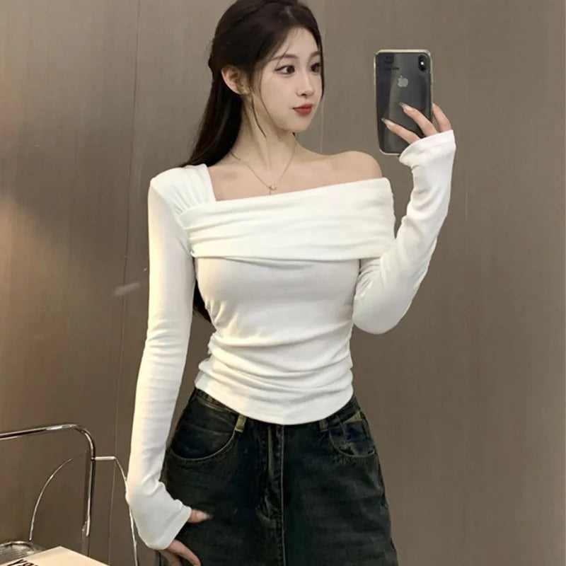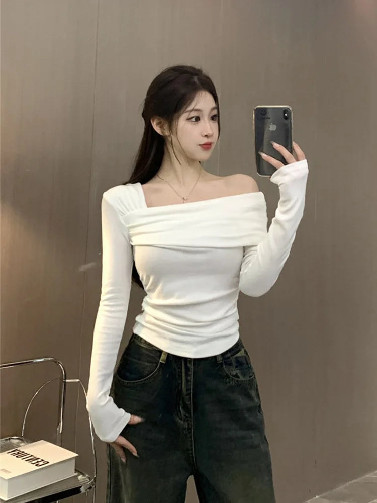 Pure Desire Sexy Spicy Long Sleeve Top Women's 2025 New Spring Cropped Off-shoulder Slimming T-shirt Korean Style