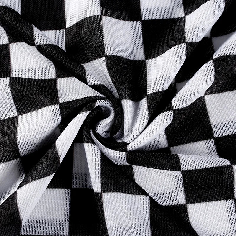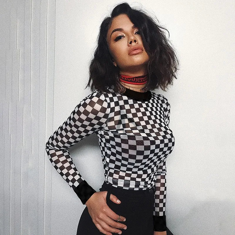 sexy black white plaid checkerboard t-shirts for women Hollow out slim top female t-shirt long sleeve tee shirts