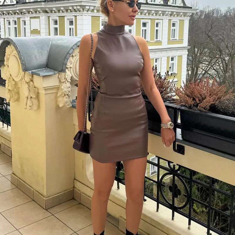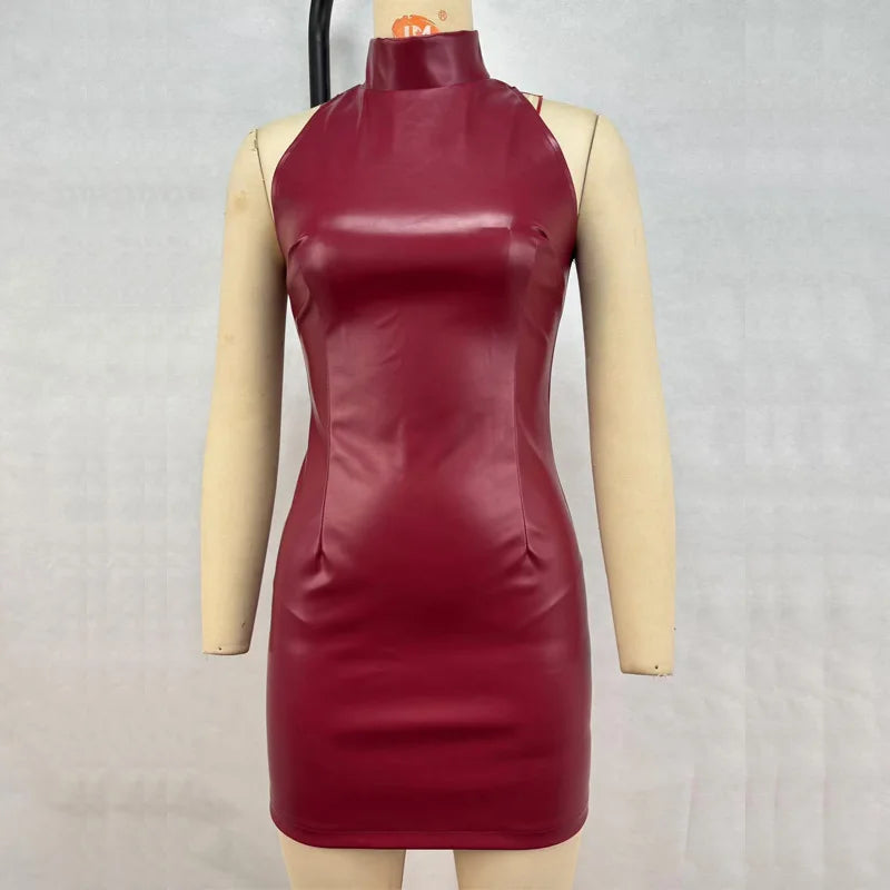 Sexy Burgundy Leather Short Dress Women Slim Turtleneck Sleeveless Hip Package Mini Dresses 2025 Autumn Lady High Waist Vestidos