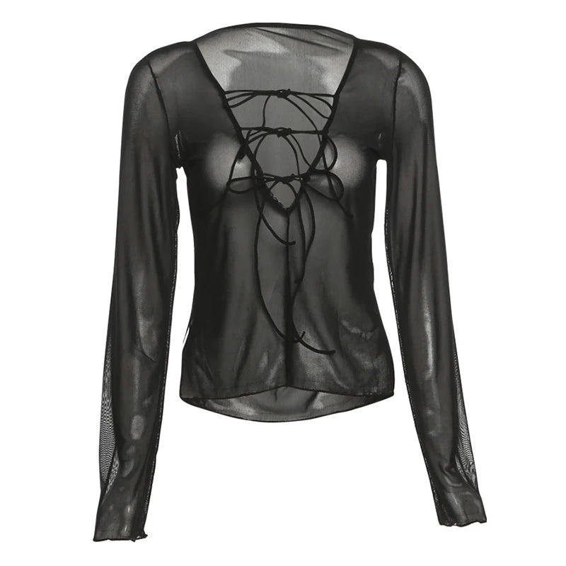 Sexy Lace Up V Neck Long Sleeve Black T Shirts for Women Female Club Wear Mesh Blouses See Through Crop Tops
