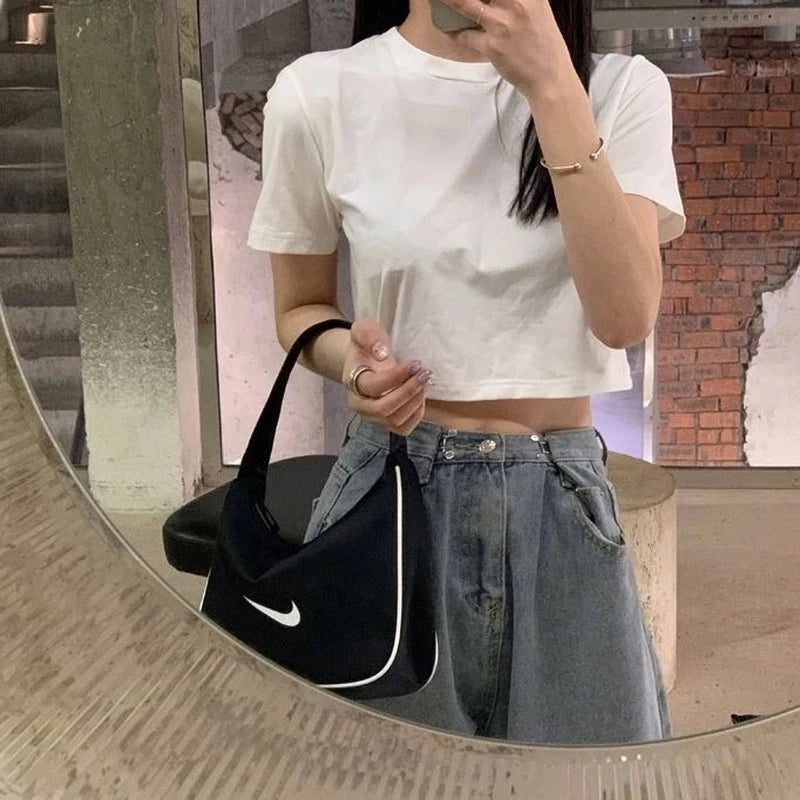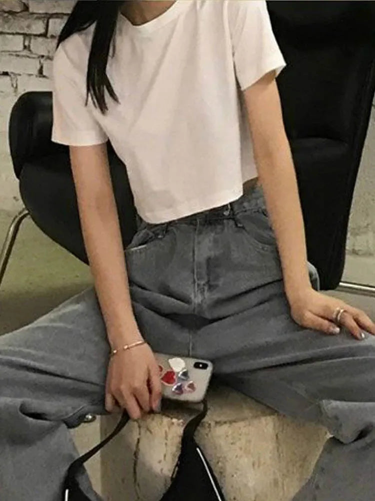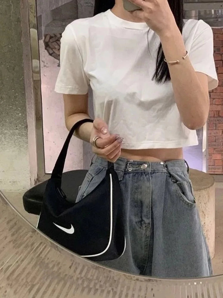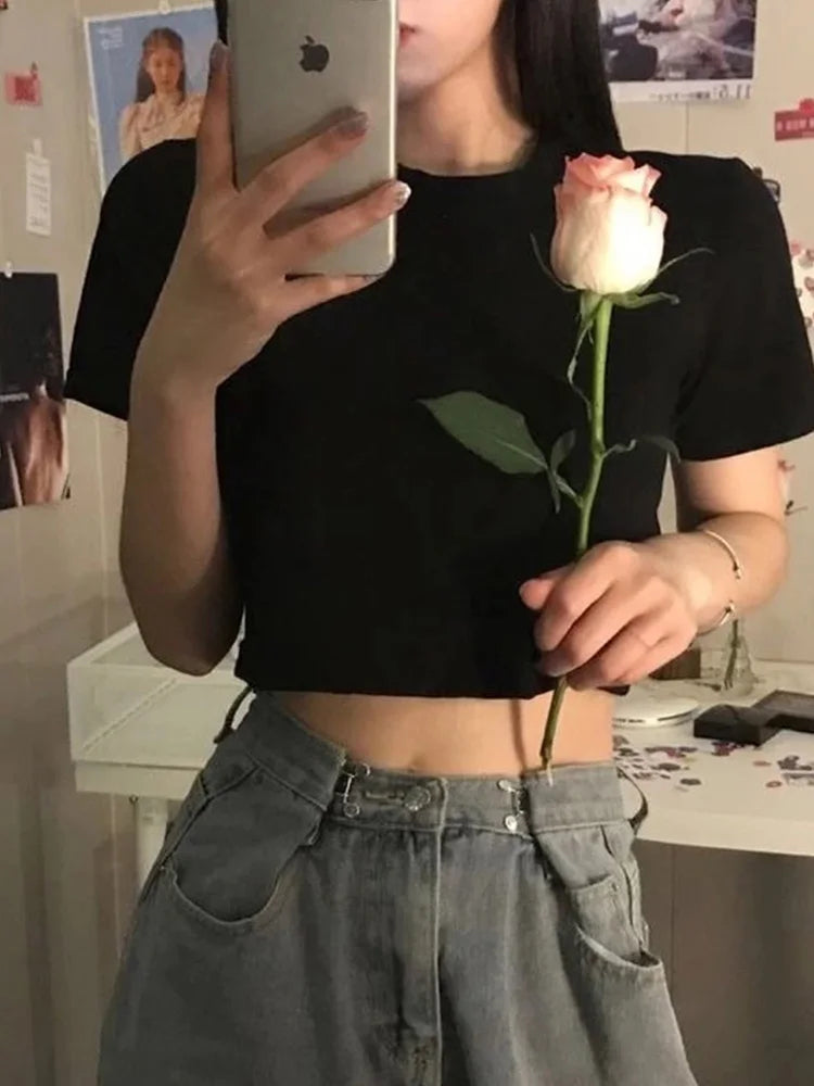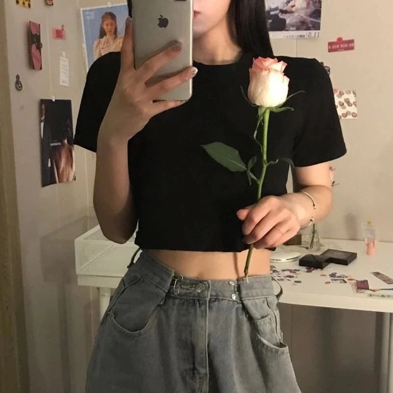 T-shirt Women Cropped Solid Sexy Minimalist Hot Sale Slim Casual Fashion Preppy Chic Basic Tops Korean Style Streetwear Popular
