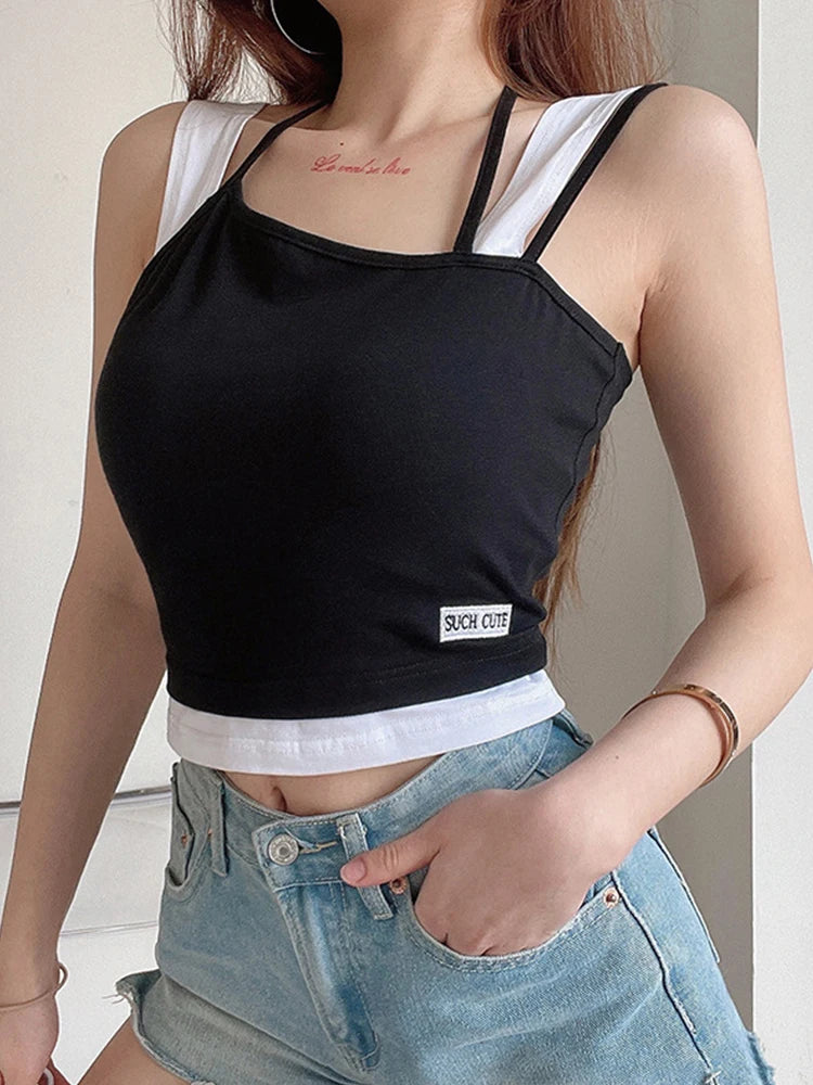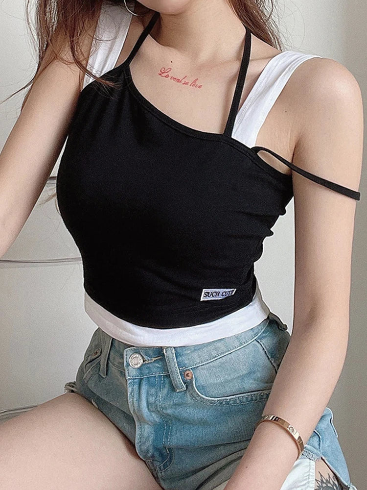 Women Hollow Out Black Y2K Tees Sleeveless Skinny Tops Cool Punk T-shirts Techwear 2023 Spring Summer New Sexy Crop Top