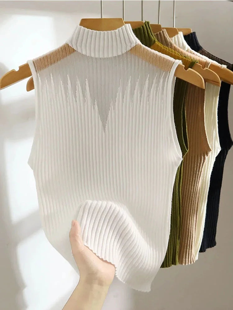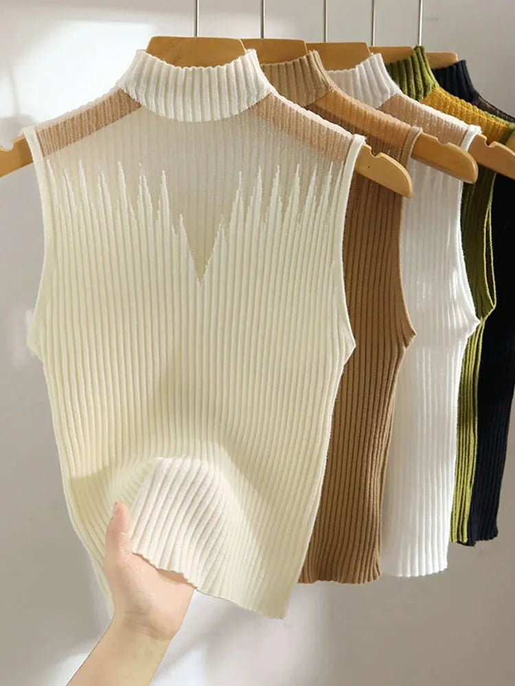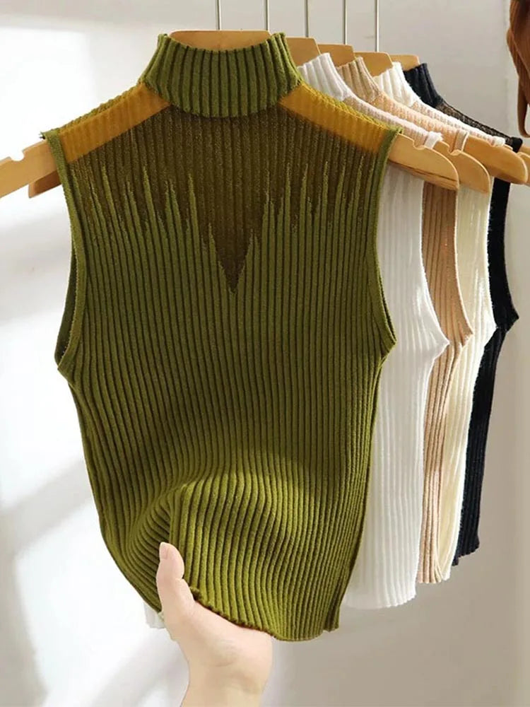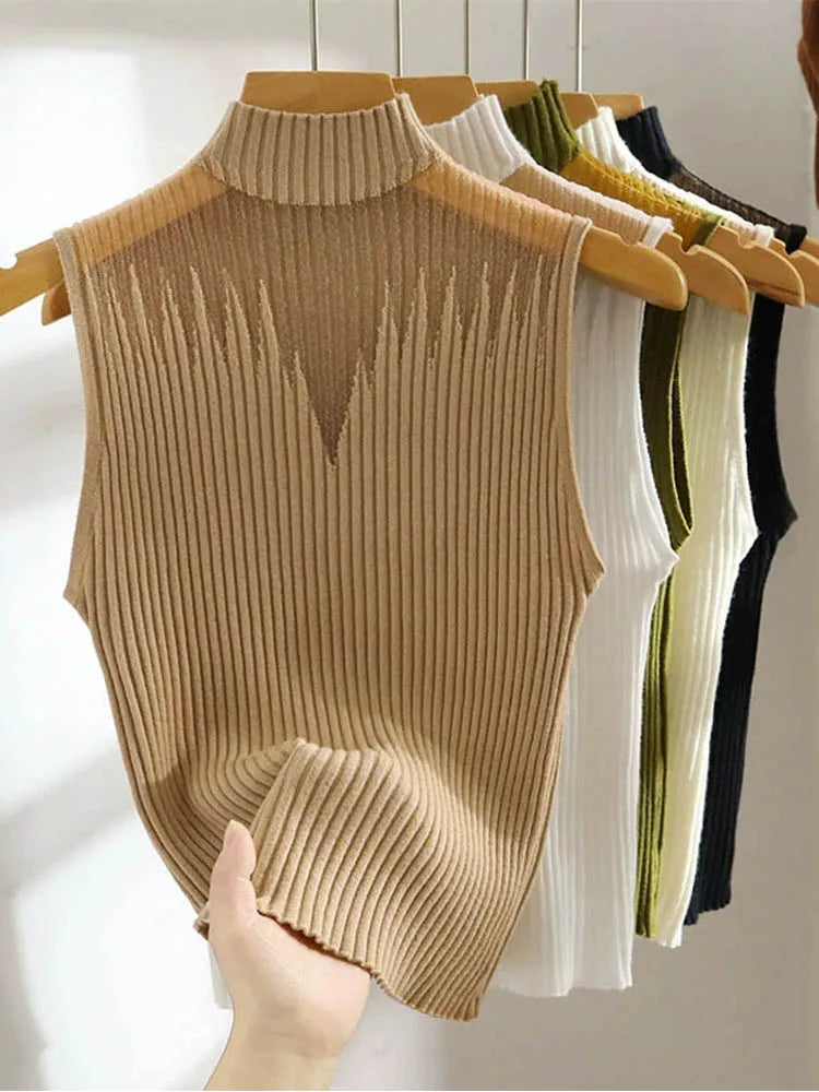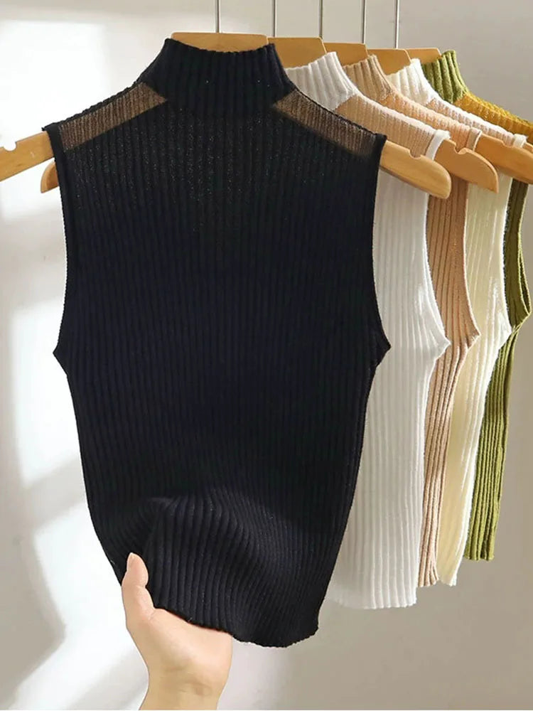 Women's mesh knitted top, Y2K sleeveless T-shirt, half neck vest, women's sleeveless sweater, custom streetwear, tube top