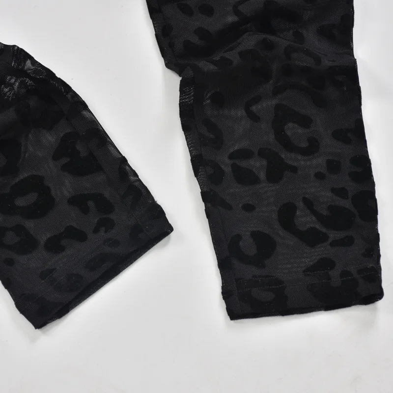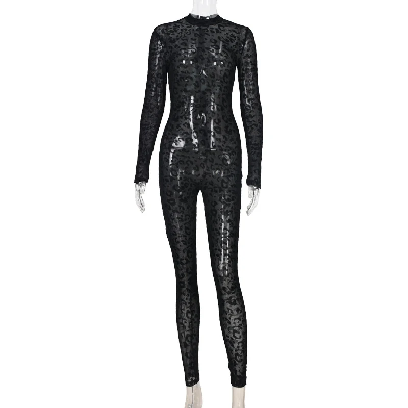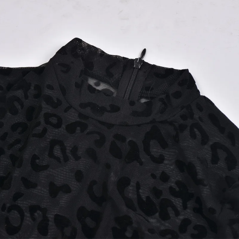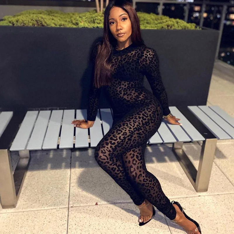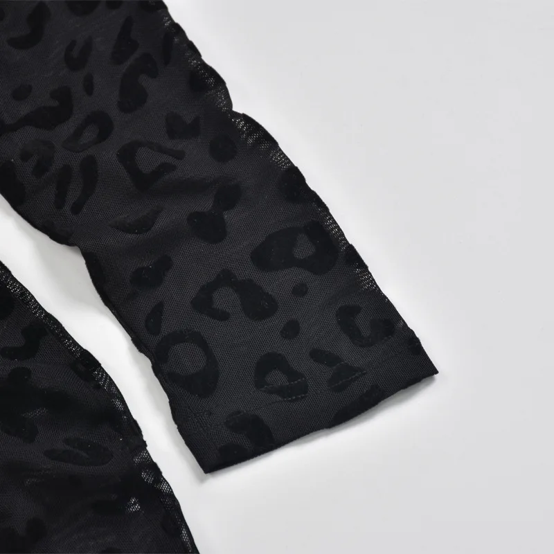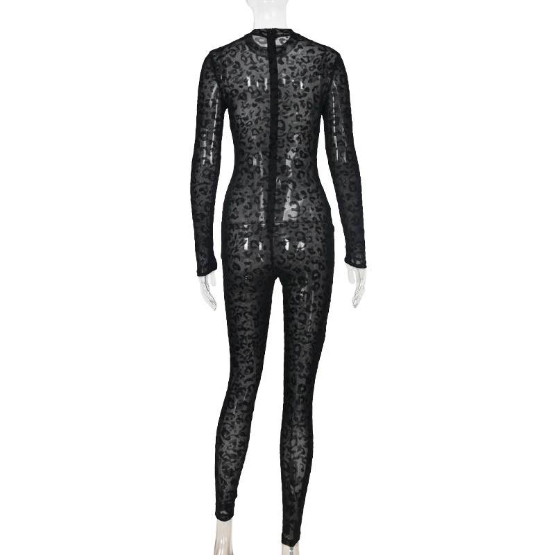 Animal Instinct Mesh Bodystocking Leopard See Through Velour Long Sleeve Rompers Womens Jumpsuit Sexy Midnight Clubwear