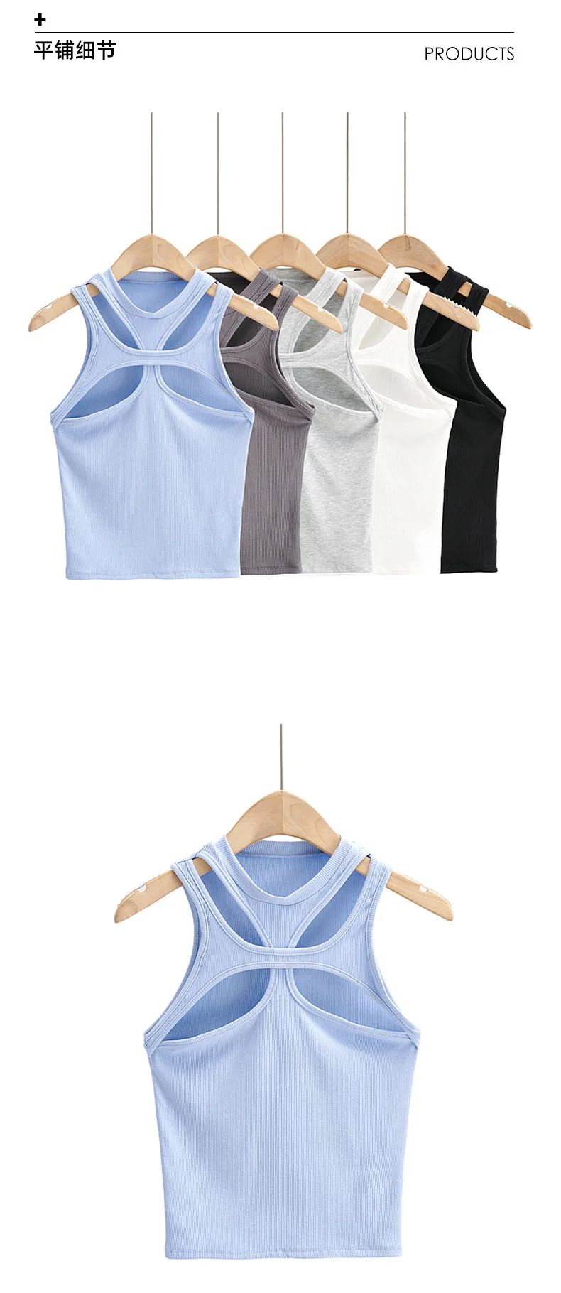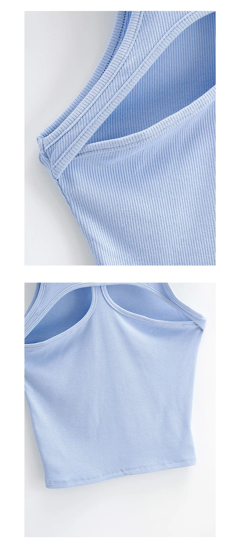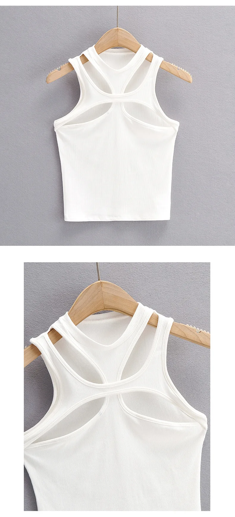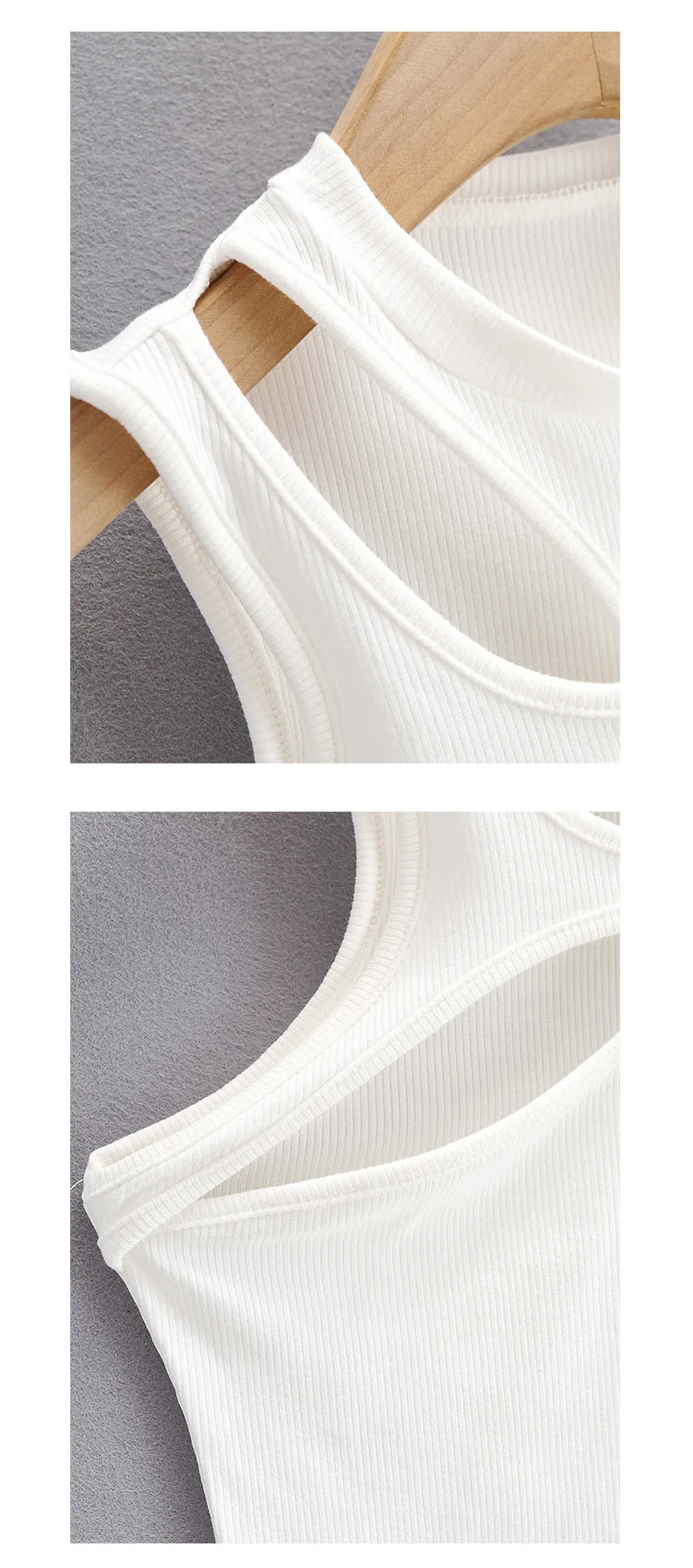 Girls New Asymmetrical Hollow Solid Color Knitted Round Neck Short-sleeved Summer Sexy Vest on The Chest