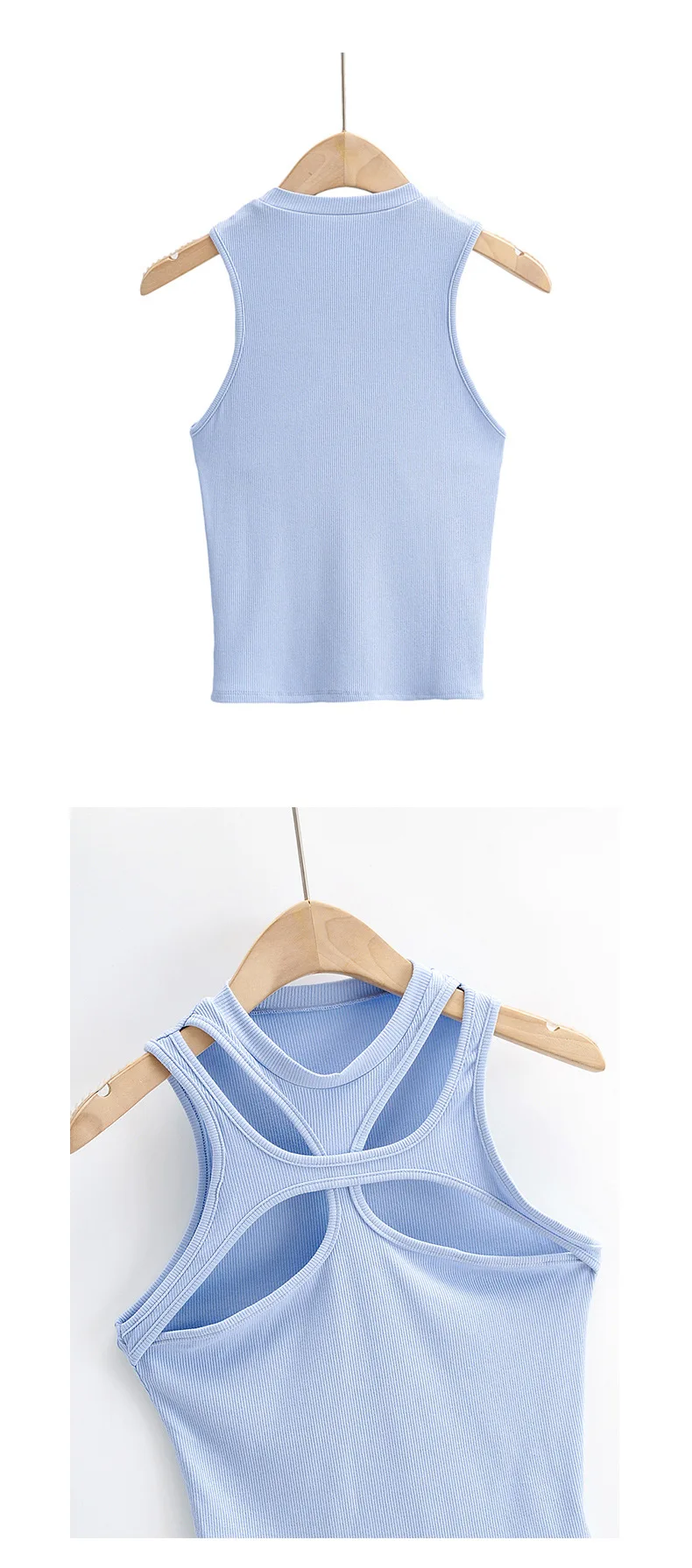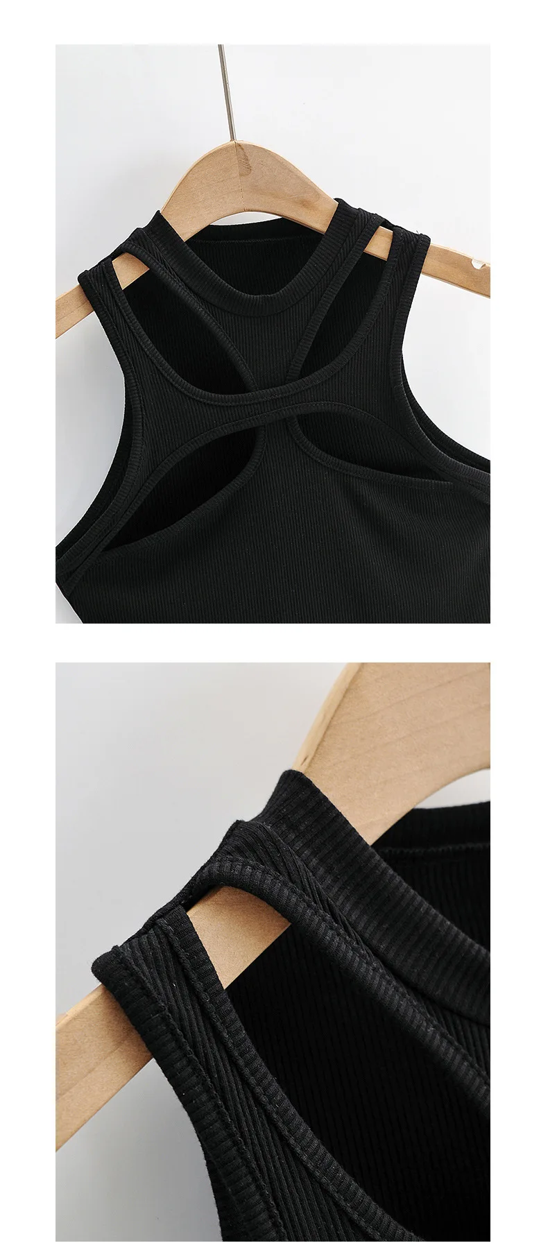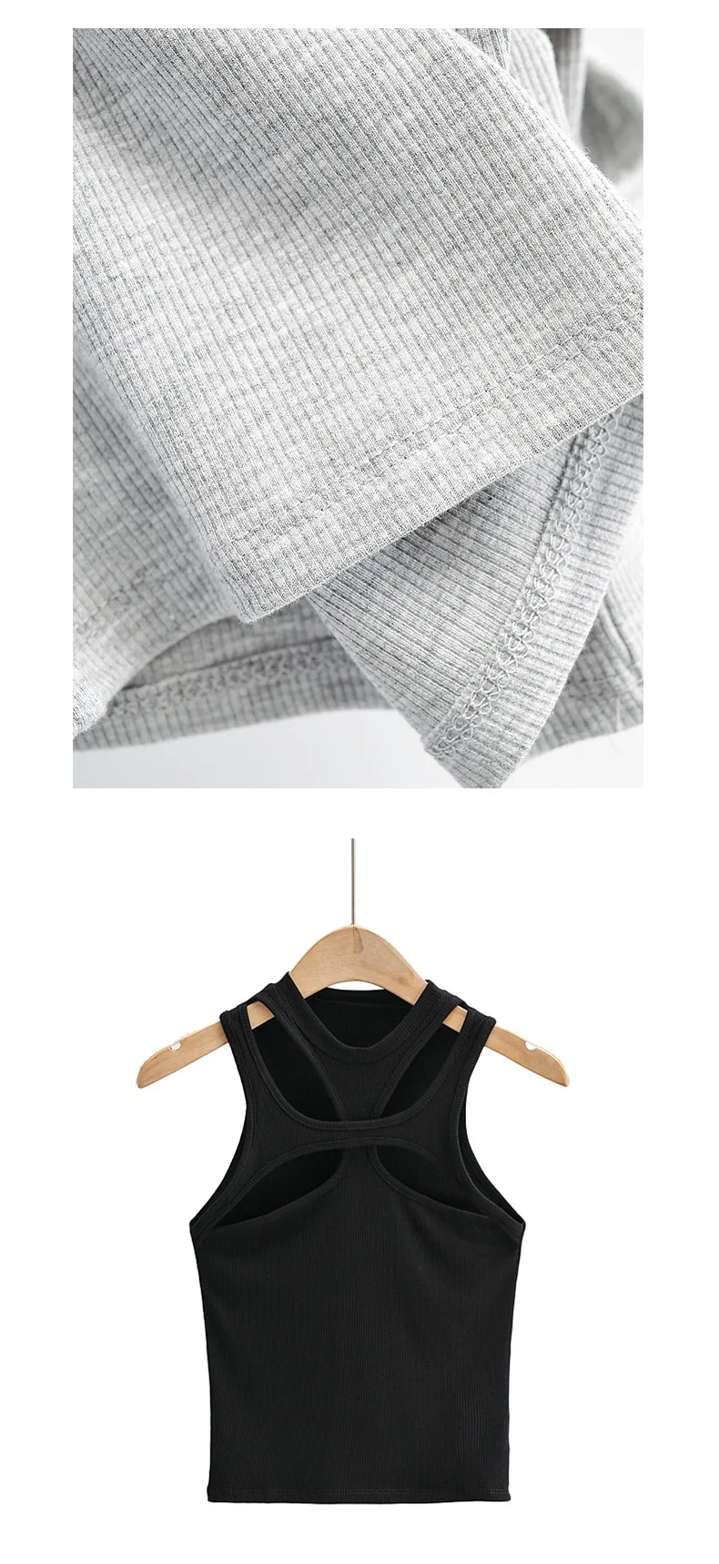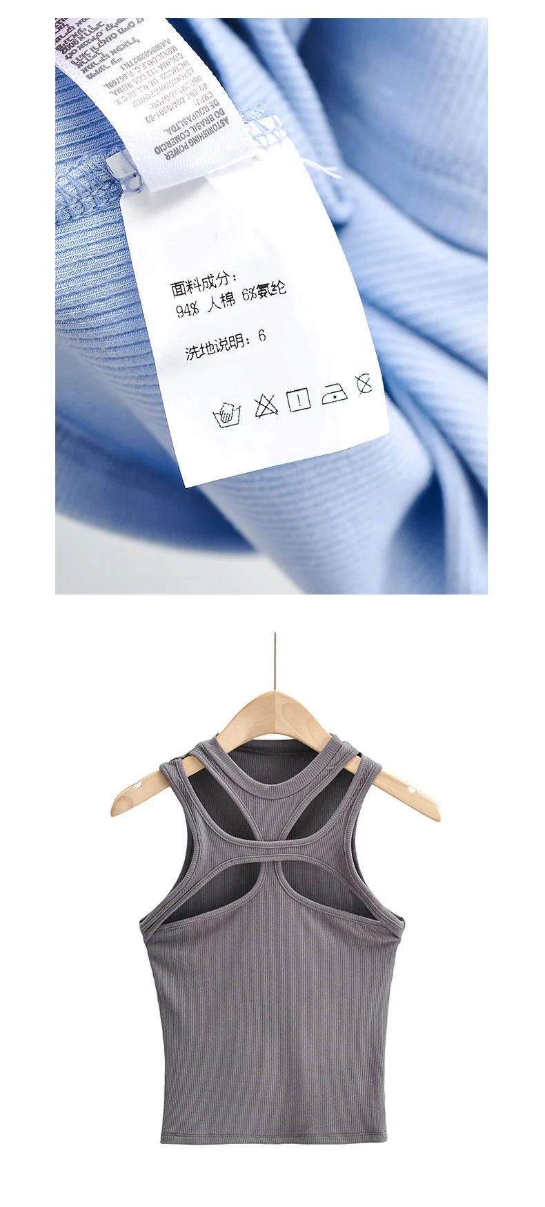Girls New Asymmetrical Hollow Solid Color Knitted Round Neck Short-sleeved Summer Sexy Vest on The Chest