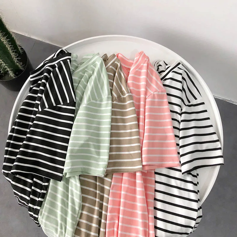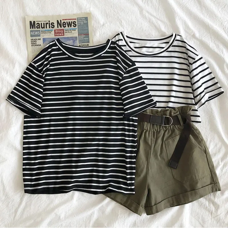 Harajuku Short Sleeve Korean O-Neck Casual Fashion Shirt Camiseta Feminina Tops T Shirt Women Solid Color Striped Punk T-shirt