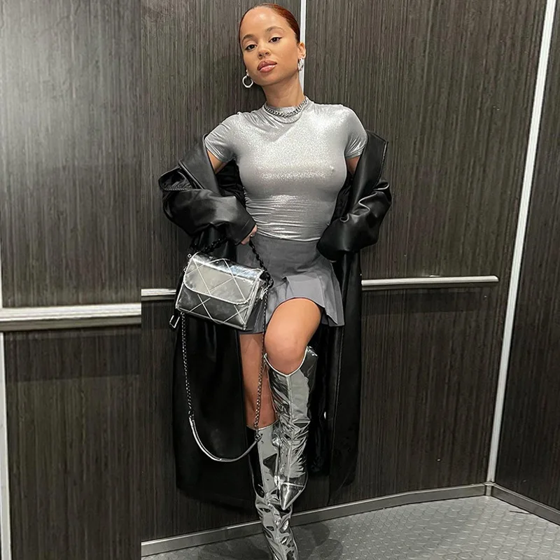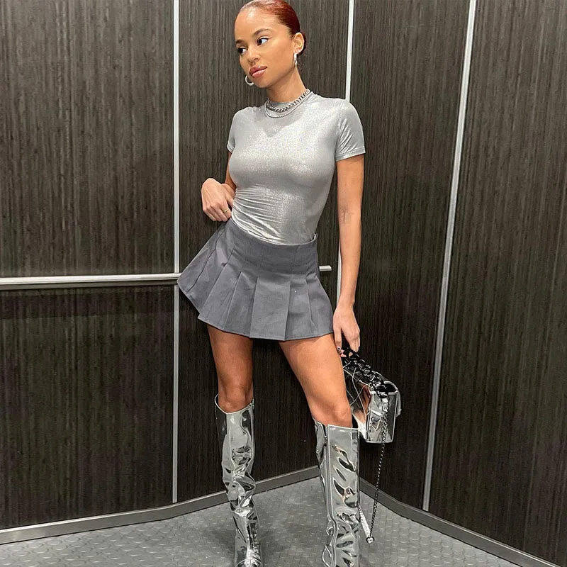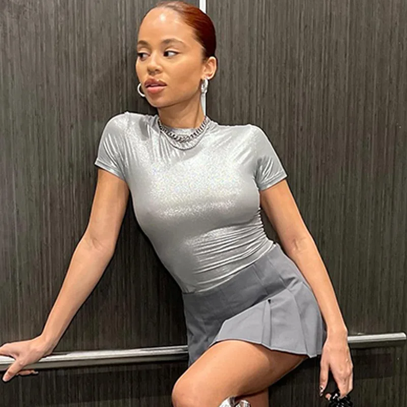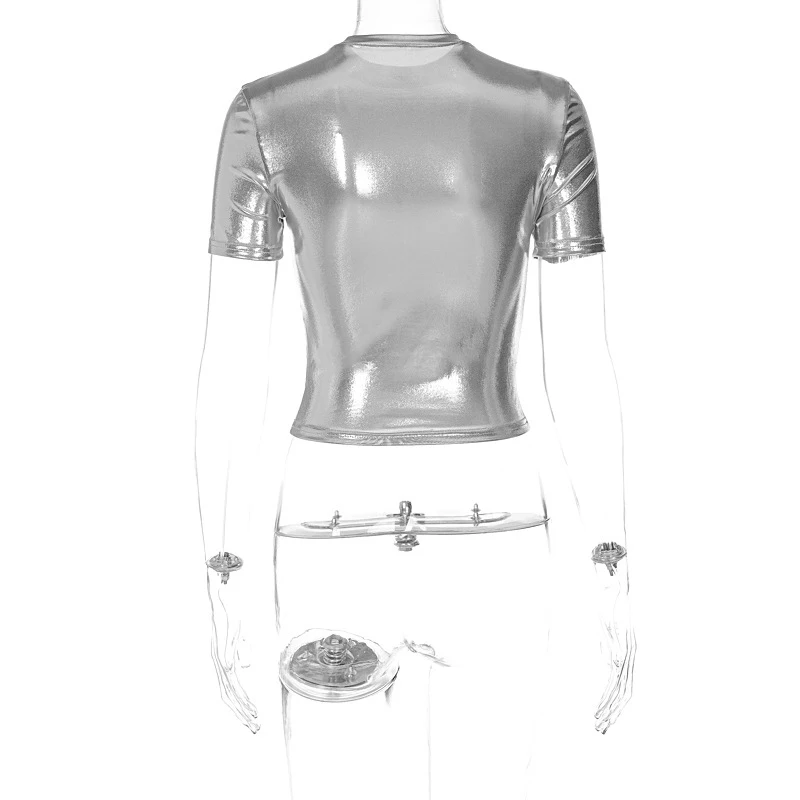 Leather Solid O Neck Short Sleeves Sexy Slim Y2K T-Shirt Top 2024 Summer Women Fashion Tees Streetwear Grunge Clothes