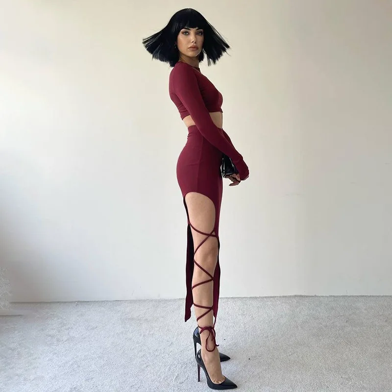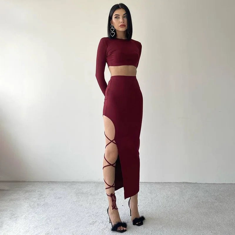Pullover Long Sleeve Simple Crop Top Elastic Waist Halter High Split Legless Sexy Tie Solid Colour Half Skirt Set