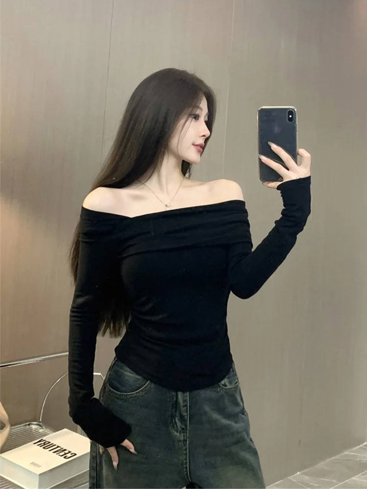Pure Desire Sexy Spicy Long Sleeve Top Women's 2025 New Spring Cropped Off-shoulder Slimming T-shirt Korean Style