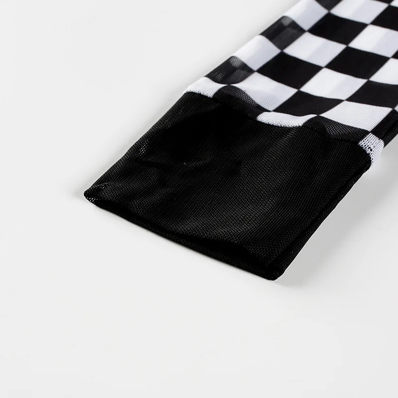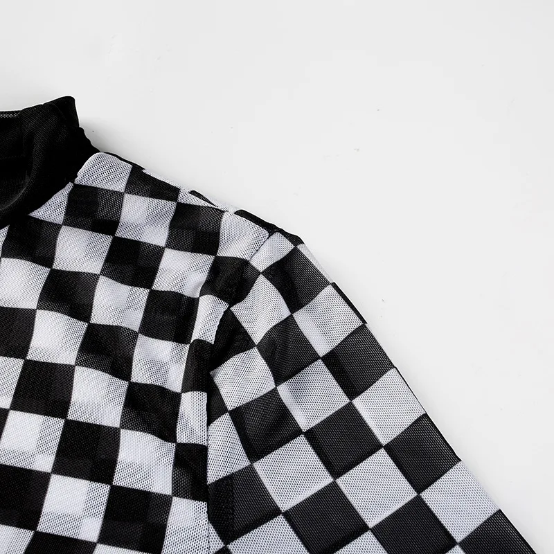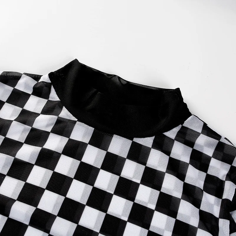 sexy black white plaid checkerboard t-shirts for women Hollow out slim top female t-shirt long sleeve tee shirts