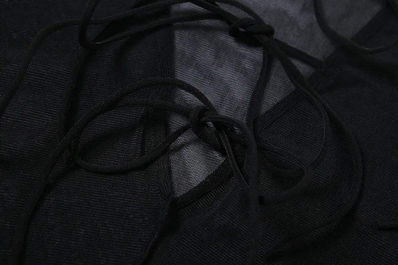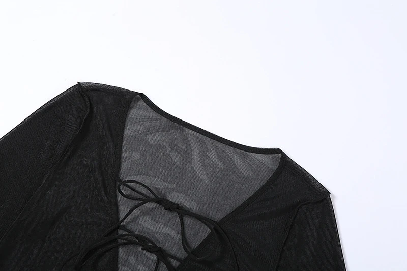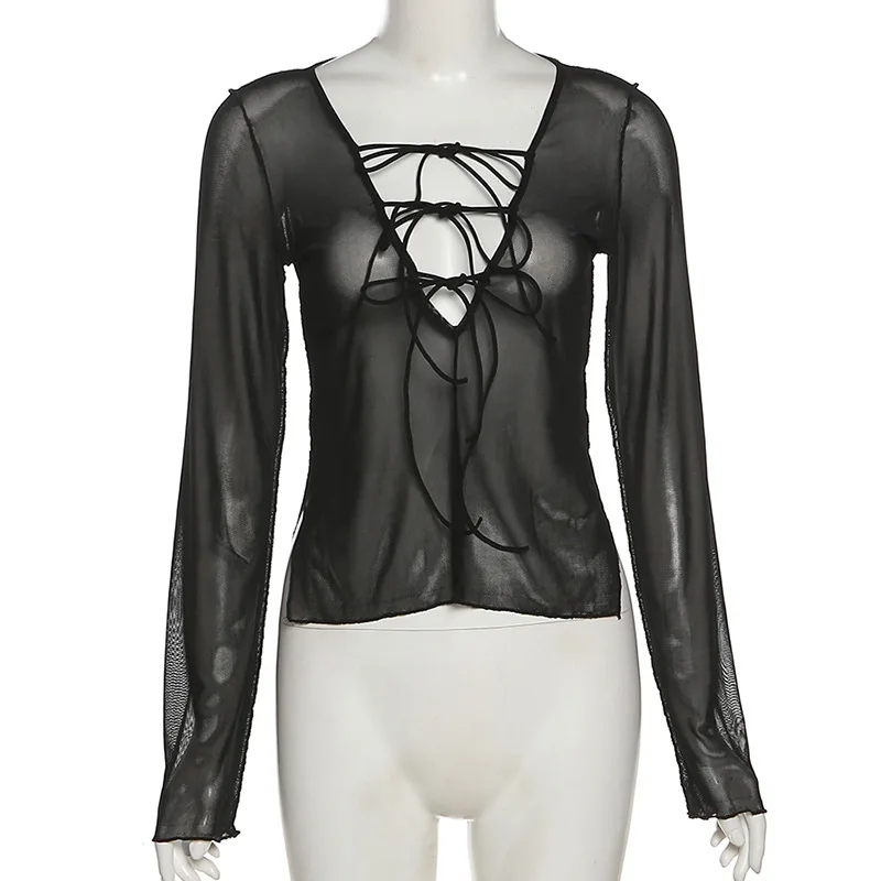 Sexy Lace Up V Neck Long Sleeve Black T Shirts for Women Female Club Wear Mesh Blouses See Through Crop Tops