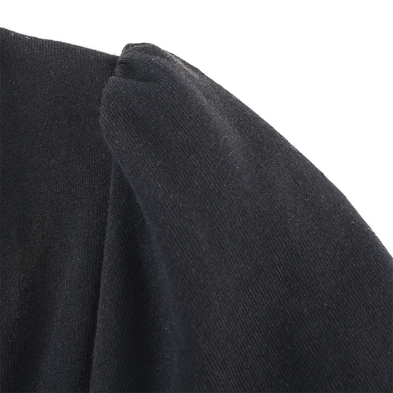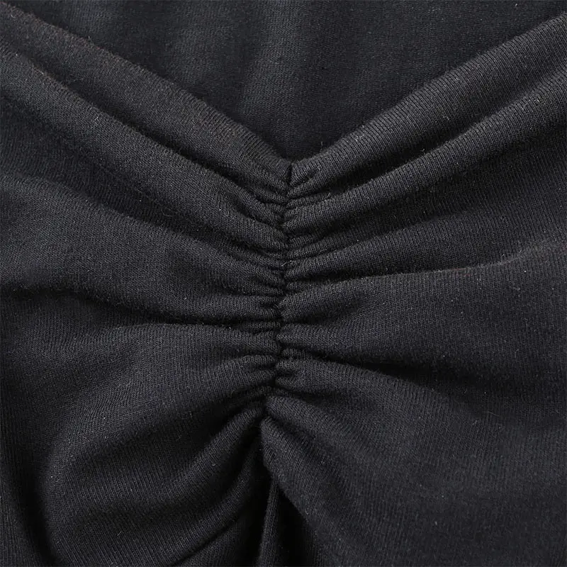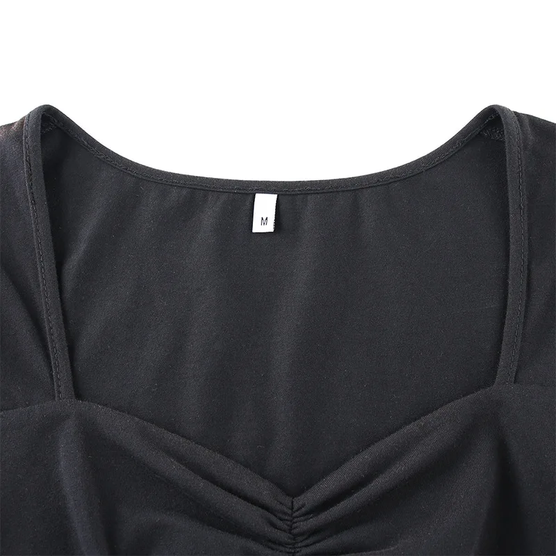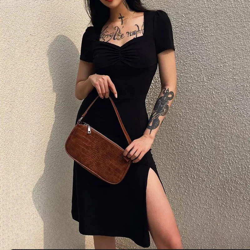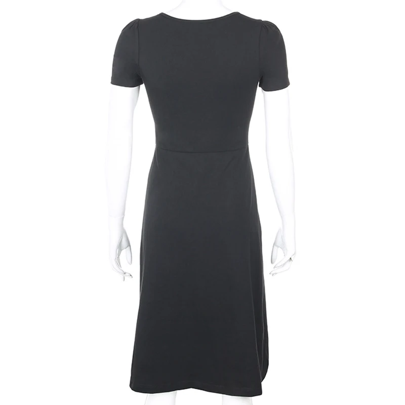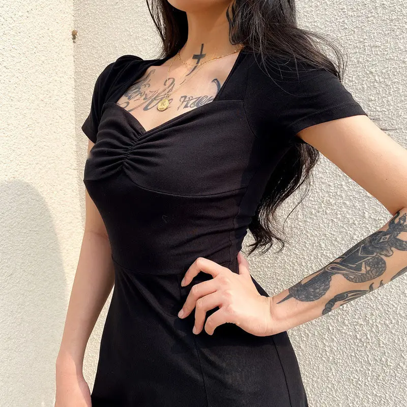 Square Neck Elegant Ruched Black Dress Side Split Short Sleeve Casual Dress Female Gothic Summer Dresses Sundress New