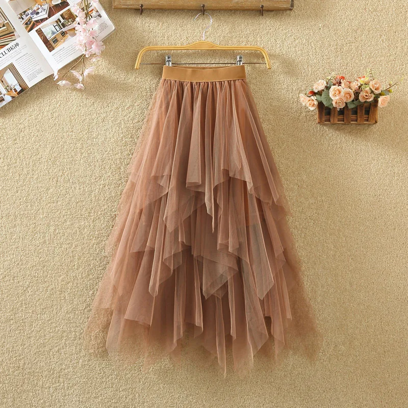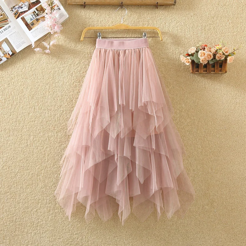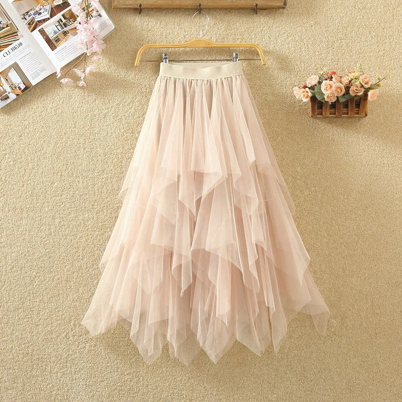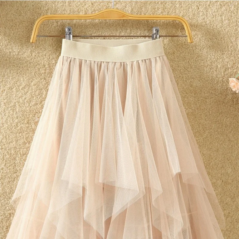 Women irregular Tulle Skirts Fashion Elastic High Waist Mesh Tutu Skirt Pleated Long Skirts Midi Skirt Saias Faldas Jupe Femmle