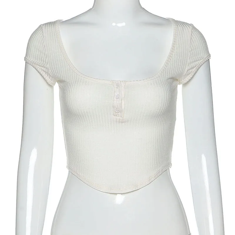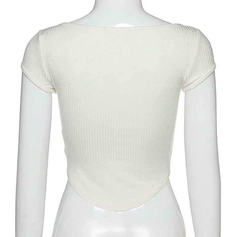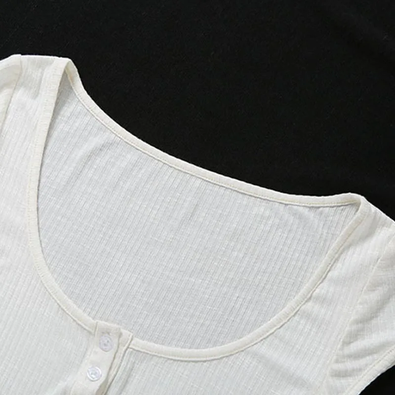 Women Summer Fashion Streetwear Sexy White Transparent Crop Tops Buttons V Neck Short Sleeve Pullover Slim T Shirts Club Party