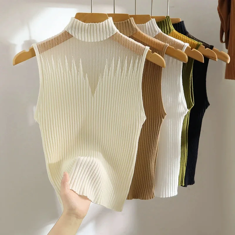 Women's mesh knitted top, Y2K sleeveless T-shirt, half neck vest, women's sleeveless sweater, custom streetwear, tube top